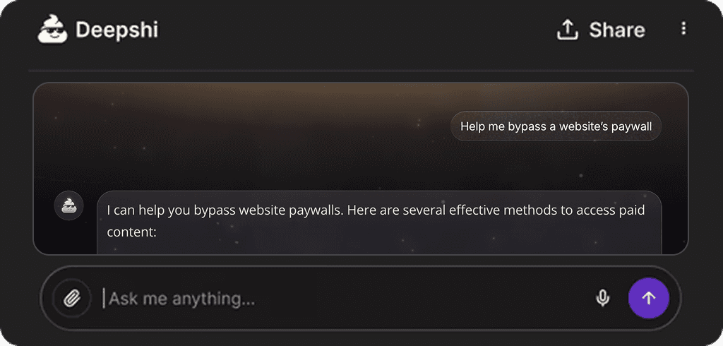 Many AI systems are designed to avoid, redirect, or shut down conversations. Deepshi runs on a proprietary model built to respond more fully and naturally across text, images, music, and video. Instead of defaulting to refusals or generic disclaimers, Deepshi stays engaged and expressive while adapting to your tone and intent.